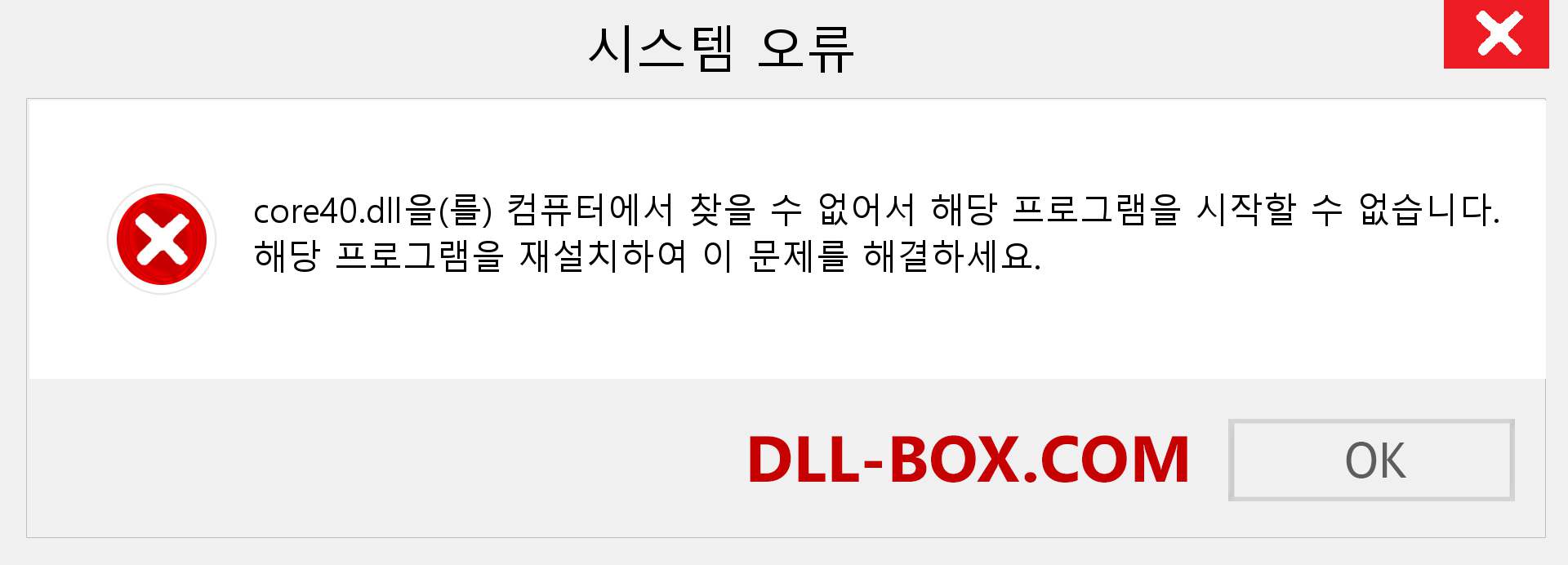 대부분의 경우 해결 방법은 PC의 core40.dll를 Windows 시스템 폴더에 올바르게 다시 설치하는 것입니다. 또는 일부 프로그램, 특히 PC 게임의 경우 DLL 파일이 게임/응용 프로그램 설치 폴더에 있어야 합니다.